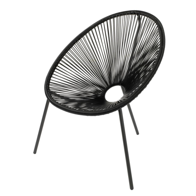 De zitting van deze fraaie stoel bestaat uit kunststof riet dat over het metalen frame is gespannen. Dit geeft een speels effect. Zeker door de mooie ronde opening. Het frame is gelakt in zwarte poederlak om roesten te voorkomen.