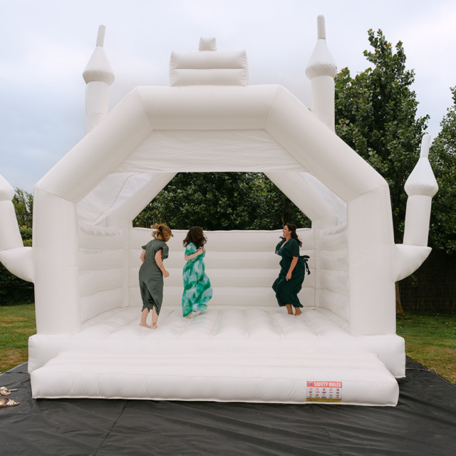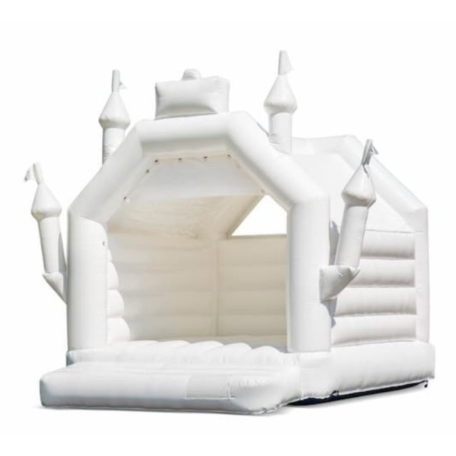 Volledig wit springkasteel, binnenin volop ruimte om grote acrobatentoeren uit te halen, meestal voor huwelijken.