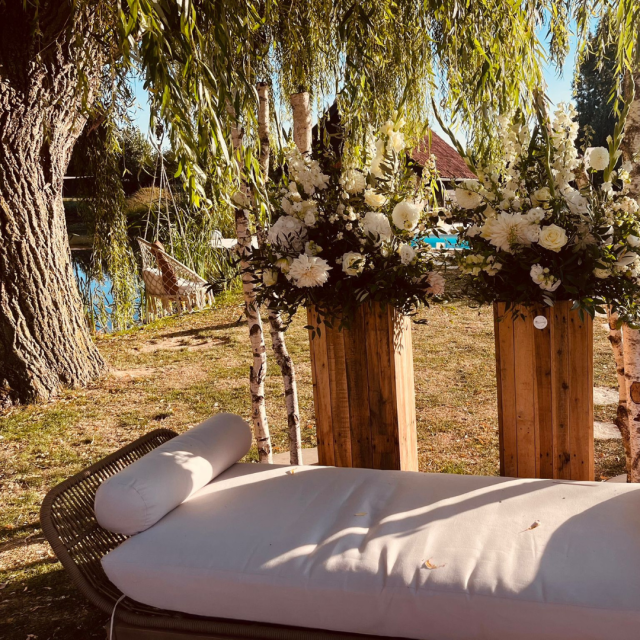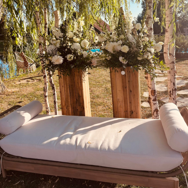 Gezellige boho bank met beige kussens. Heel fijn voor ceremonie in de tuin of binnen in onze zaal.