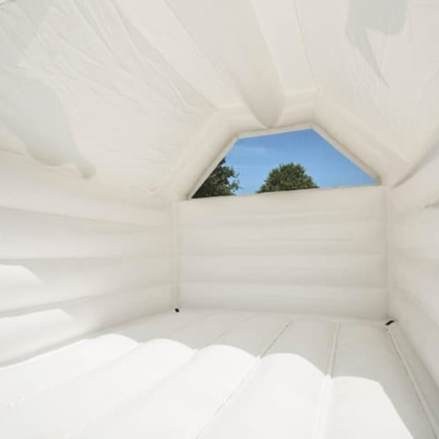 Volledig wit springkasteel, binnenin volop ruimte om grote acrobatentoeren uit te halen, meestal voor huwelijken.