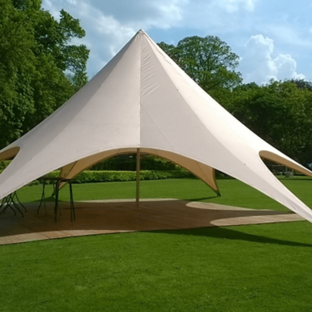 Onze beige startent of starshade is de perfecte blikvanger voor elk evenement. Dankzij de opvallende hoogte en elegante uitstraling van de startent springt ze van kilometers ver in het oog. Onze stertent is uitstekend in te schakelen voor een ceremonie of receptie, maar bijvoorbeeld ook een diner, communiefeest of huwelijk. Met een starshade laat je ongetwijfeld een blijvende indruk na op je gasten.