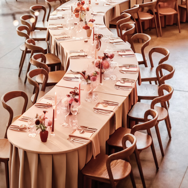 Plaatsing van het tafellinnen op de speciale slangentafel inbegrepen in de huurprijs.